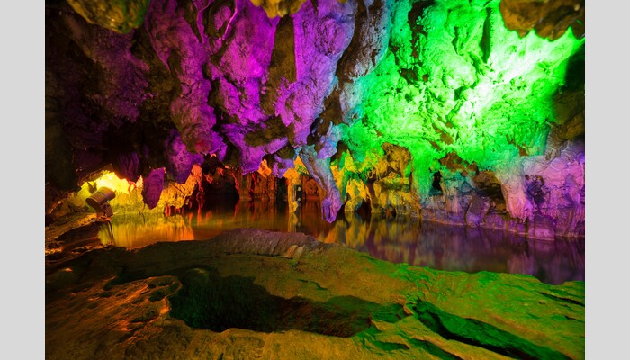 県の天然記念物に指定されている全長約450mの鍾乳洞。昭和4年に歌人与謝野鉄幹・晶子夫婦が「奇に満ちた洞」と詠んだことから、満奇洞(まきどう)と呼ばれるようになりました。静寂に包まれた洞内はカラフルなLEDでライトアップがされているため神秘的な雰囲気です。