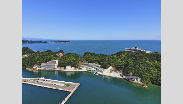 勝浦港の向かいに防波堤のように伸びている狼煙山半島。半島全体がホテル浦島となっており、広さはなんと東京ドーム4.5倍もあります。対岸から専用送迎船にのってホテル浦島へ!およそ5分の船の旅です♪