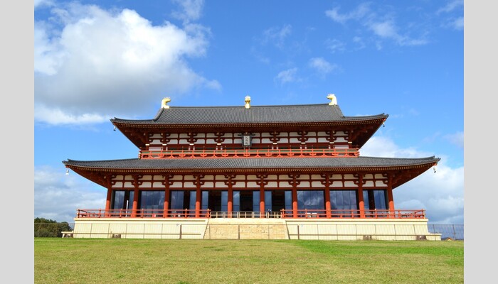 「平城宮跡」は、和銅3年(710)に藤原京より遷都された平城京の中心であった宮跡。1998年2月に「古都奈良の文化財」として、世界遺産に登録されました。「第一次大極殿」や2022年に完成した「大極門(第一次大極殿院南門)」、「東院庭園」、「朝堂院」、平城京遷都1,300年の記念事業の一環として復原された「朱雀門」など、数多くの復元施設が全域にわたって点在します。