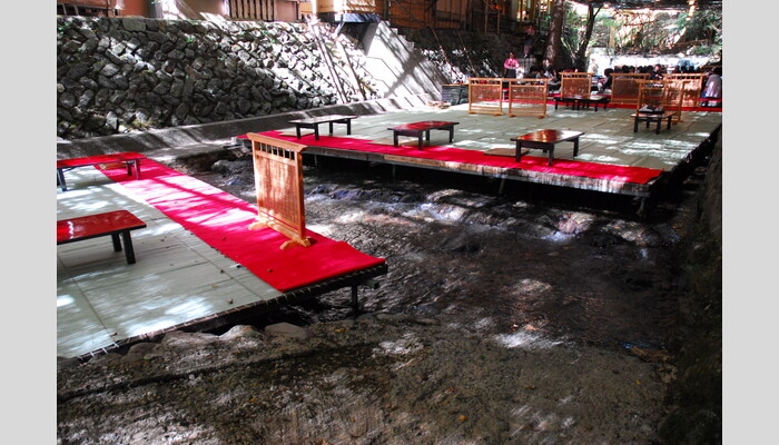 貴船で最大級の広さを誇る、貴船べにやの川床の上は、貴船の清流をわたり涼やかに流れる涼風が吹き、京都市内に比べて10℃近くも涼しく、クーラーとはまた違う心地よい涼しさです。