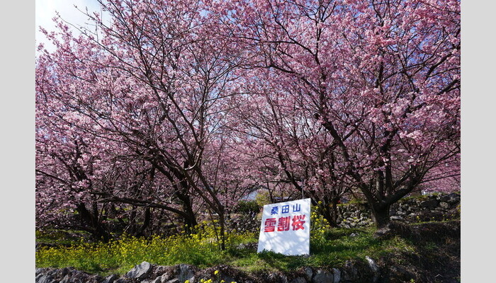 濃い桃色の美しい花をつけることで有名な桑田山の雪割桜は、2月中旬から3月中旬頃のまだ雪の残る寒い時期に咲く大変珍しい桜で、桑田山地区全体には千本近くあります。菜の花とのコラボレーションもお楽しみいただけます。細い山道は大型バスは通れませんので、途中小型バスに乗り換えます。