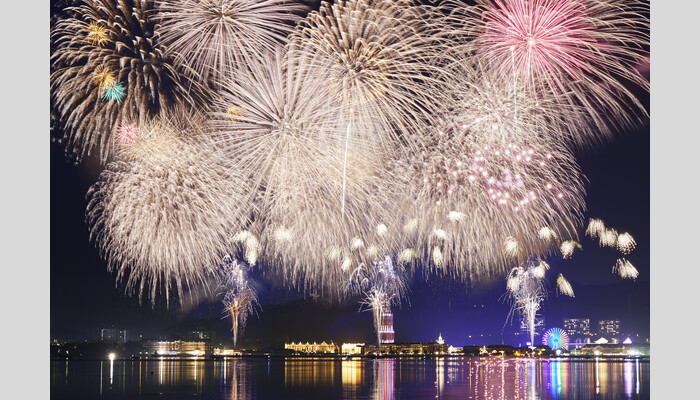 長崎県のハウステンボスで開催される西日本最大級の花火大会です。打ち上げ総数は約2万2000発にも上ります。世界最高峰を誇る日本の有名花火師30社による「一尺玉競演会」や、クライマックスの5分間で5000発が打ち上がる「大スターマイン」が最大の見どころで、夜空いっぱいに広がる圧巻の光景を楽しめます。花火を間近で楽しめる安心の特別観覧イス席(パノラマビュー会場)も用意しております。