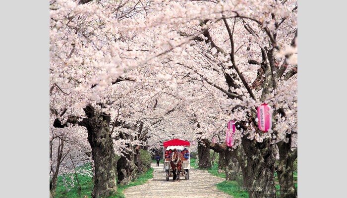 「さくら名所100選」に数えられ、北上川沿い約2kmにわたり約1万本の桜が咲き誇る、東北有数の桜回廊です。最大の見どころは、樹齢100年を超えるソメイヨシノが重なり合う「桜のトンネル」。さらに、大河の上空を彩る約300匹の鯉のぼりと、川面をゆく観光遊覧船の情景はまさに日本の原風景。ゆったりと流れる時間の中で、みちのくの春の息吹を全身で感じていただけます。 -