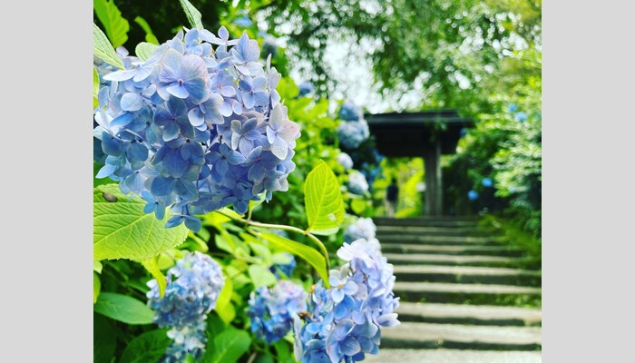 境内を埋め尽くす約2,500株のヒメアジサイは、優雅で深い青色が特徴で「明月院ブルー」と称えられます。本堂にある円窓「悟りの窓」から望む庭園風景も絶景です。