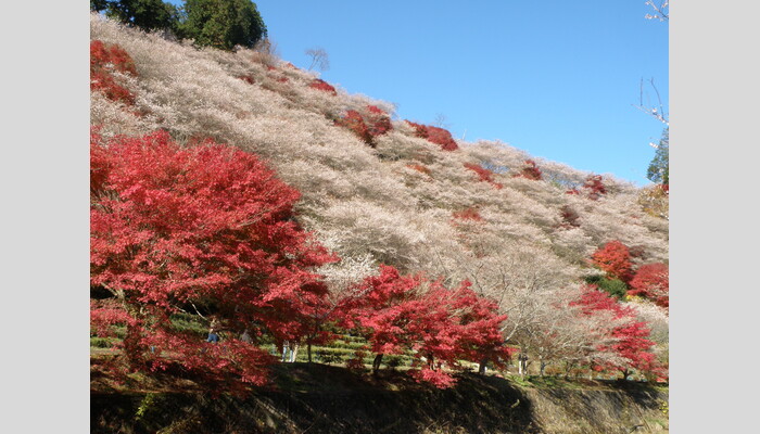 春と秋に花を咲かせる四季桜。山の斜面全体に約1,200本もの木が広がり、桜のピンクと、紅葉の赤色の共演が一面に広がります。