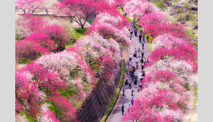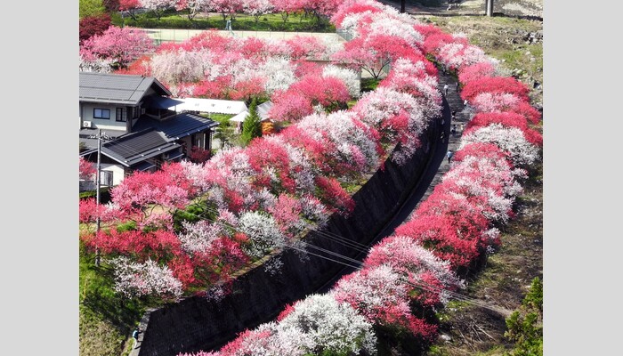 ②約5,000本の赤、白、ピンク3色の花が咲き誇る 日本一の桃源郷 花桃の里
