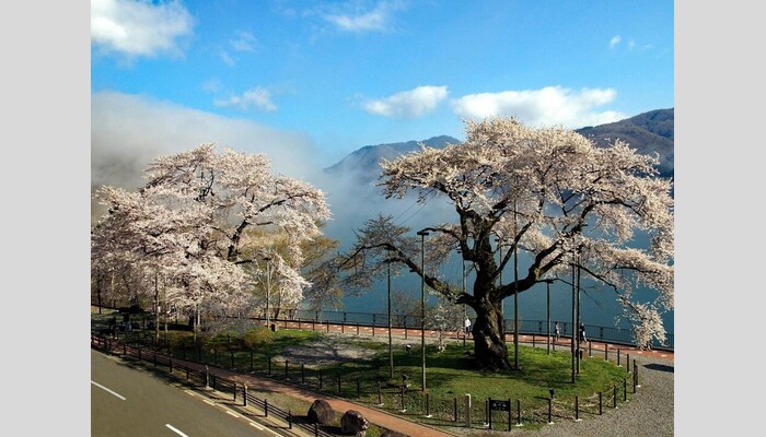 御母衣ダムによってつくられた御母衣湖畔の展望台に立っている2本の巨桜は、樹齢500余年といわれるアズマヒガンザクラです。いまは湖底に沈む照蓮寺と光輪寺の境内にあったもので、世界の植樹史上例のない巨桜の大移植により、現在もいにしえと変わらず壮大に咲き誇っています。