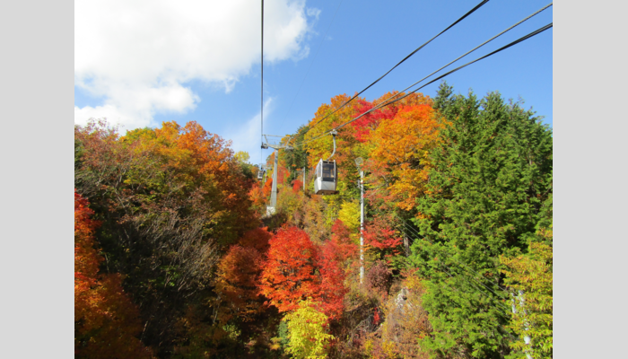 紅葉は長野県と岐阜県の県境に位置する富士見台高原(1739m)より始まり、約1カ月にわたって楽しめます。全長2500m、標高差600mのロープウェイの紅葉は10月中旬から楽しめ、約15分間の空中散歩では、高地になるにつれ深まりゆく秋の様子を見ることができます。