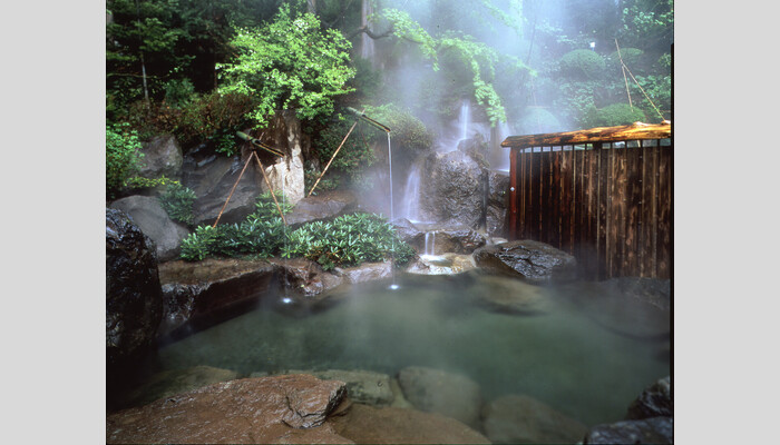 また、新緑が綺麗な立ち湯は目の前に広がる自然と一体となれます。立った姿勢で腰上までつかることのできる立ち湯は、循環器を整えるほか、血行が良くなるといわれています。泉質は、お肌がすべすべになるアルカリ単純泉です。