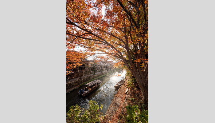 八幡堀は、流通を支える貴重な水脈として、近江商人の発祥と発展に貢献してきたが、近年は観光名所や時代劇のロケ地として知られています。秋になると、お堀沿いの紅葉が色づき、水面や旧家の白壁に映え美しい場所です。八幡堀めぐりの船から、約35分の遊覧をお楽しみください。