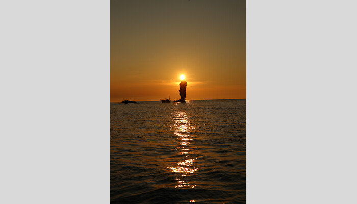 夕暮れになると日本海へと沈み行く真っ赤な夕陽がまるでろうそくの様に灯る神秘的な造形を船上から。