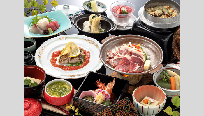 ご夕食は、黒毛和牛付き和会席もしくは、黒毛和牛ステーキがメイン料理の鉄板焼きコースのご夕食よりお選びいただけます。