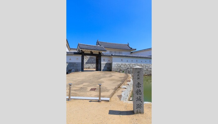 浅野長直の指示によって慶安元(1648)年から13年の歳月をかけて築かれた赤穂城は、近世城郭史上非常に珍しい変形輪郭式の海岸平城です。藩の家臣で軍学師範の近藤正純が設計し、そのうち二之丸門虎口の縄張は、当時の著名な軍学者であった山鹿素行の手が加えられたと伝えられています。城地は、東に千種川、南は瀬戸内海に面し、清水門の南にある船入は船が出入りできるようになっていました。昭和46年に国史指定を受け、平成14年には本丸庭園と二之丸庭園が国の名勝に指定され、平成18年には『日本100名城』に選ばれました。本丸内には刃傷事件後に大石内蔵助らが大評定に集まった御殿の間取りが復元されており、天守台からは本丸内はもとより広々とした赤穂の風景が眺められます。