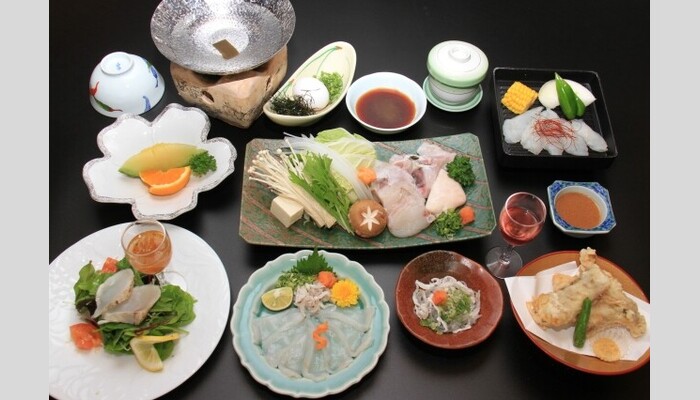 ・食前酒・てっぴ・焼きふぐ・てっさ・ふぐちり一人鍋・ふぐ唐揚げ・焼霜サラダ・茶碗蒸し・雑炊・香の物・フルーツ