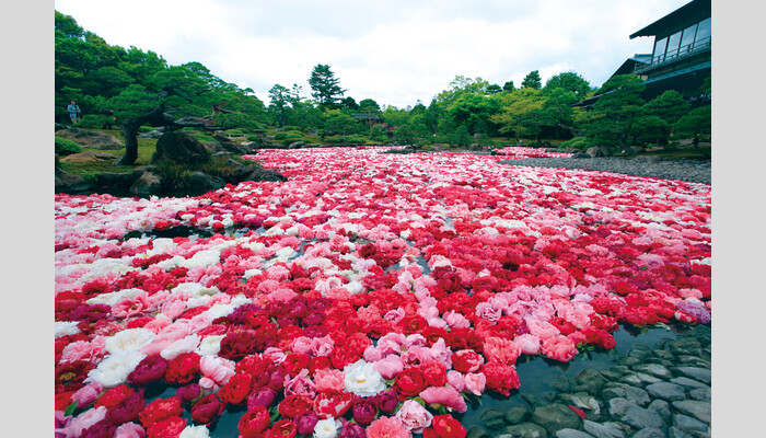 大根島は日本一の牡丹苗の生産地。由志園の池泉に三万輪の牡丹を浮かばせています。