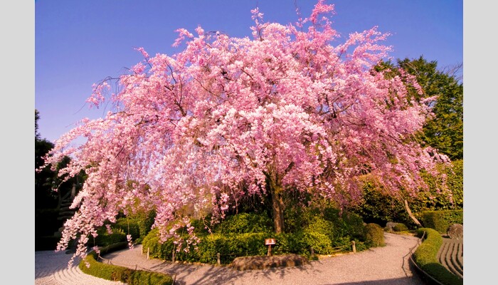 臨済宗大本山妙心寺の塔頭寺院である退蔵院の境内には、史跡名勝・枯山水庭園「元信の庭」、そして四季折々の景色が美しい池泉回遊式庭園「余香苑(よこうえん)」などがあります。樹齢50年ほどの紅しだれ桜は、平安神宮にある紅しだれ桜の孫桜で、門をくぐると見える姿は圧巻です!