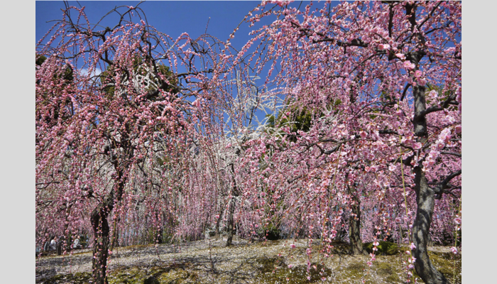 城南宮の神苑「楽水苑」は、『源氏物語』に描かれた80種あまりの草木が植栽され、「源氏物語花の庭」として親しまれています。社殿西側に広がる神苑・楽水苑の春の山には、約150本の紅白のシダレウメが香り高く咲きそろいます。