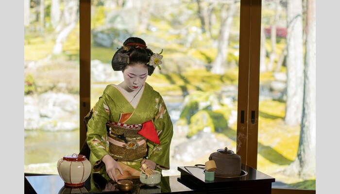 梅が咲き誇る庭園をご散策いただいたり、お茶席では華やかな装いの舞妓さんによる優雅なお点前をご覧いただけるほか、お茶の接待を受けることができます。