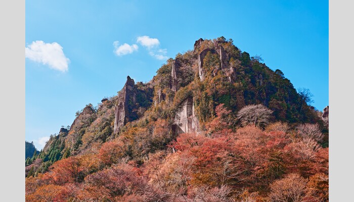 京都の嵐山、栃木の日光と並び日本三大紅葉名所として知られる大分県中津市の「耶馬渓(やばけい)」。耶馬渓の代表的な景勝地「一目八景」。一目で、群猿山(ぐんえんざん)、鳶ノ巣山(とびのすやま)、嘯猿山(しょうえんざん)、夫婦岩(ふうふいわ)、雄鹿長尾の峰(おじかながおのみね)、烏帽子岩(えぼしいわ)、仙人岩、海望嶺(かいぼうれい)の八景が一望できることから名づけられました。紅葉と荒々しい岩の対比が、自然の力強さを感じさせてくれる紅葉スポットです。例年10月下旬~11月中旬頃に見頃を迎えます。