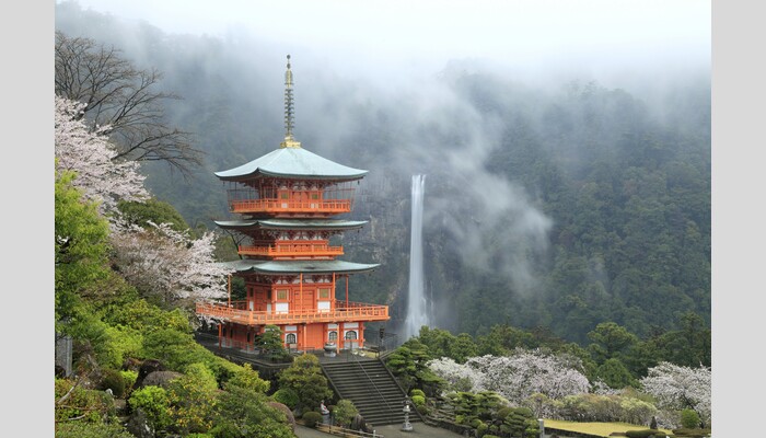 那智山は熊野三山の一つ。熊野信仰の霊場として那智の滝を中心にした神仏習合の一大修験道場だったが、明治初期に青岸渡寺と那智大社に分離した。今も寺と神社は隣接していて、双方を参拝する人が多い。